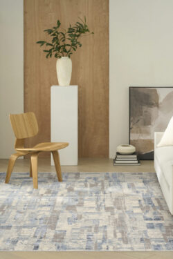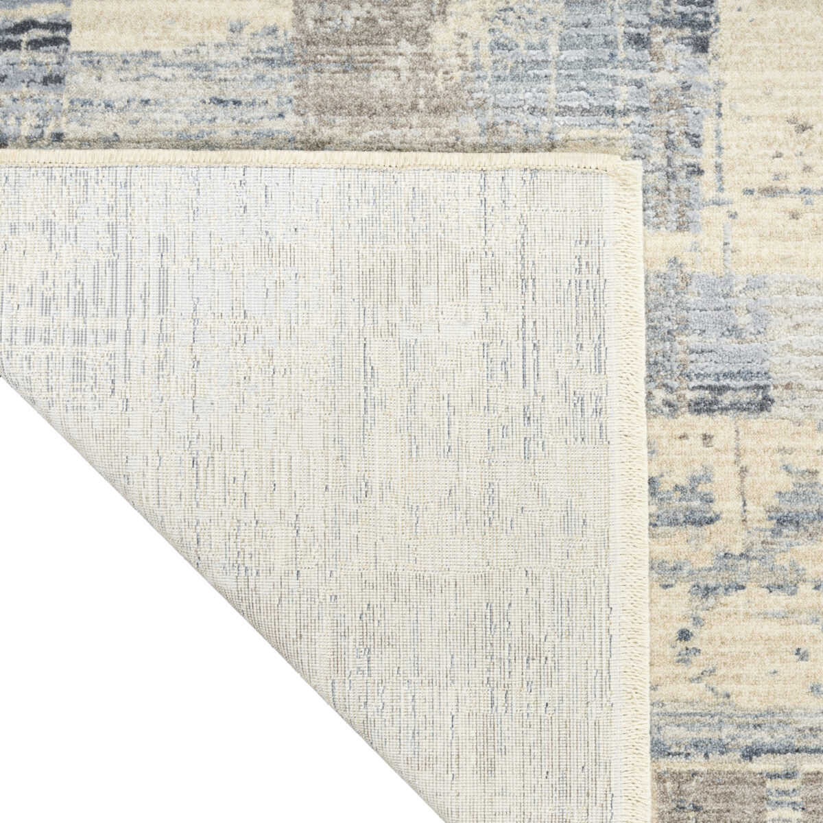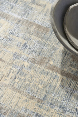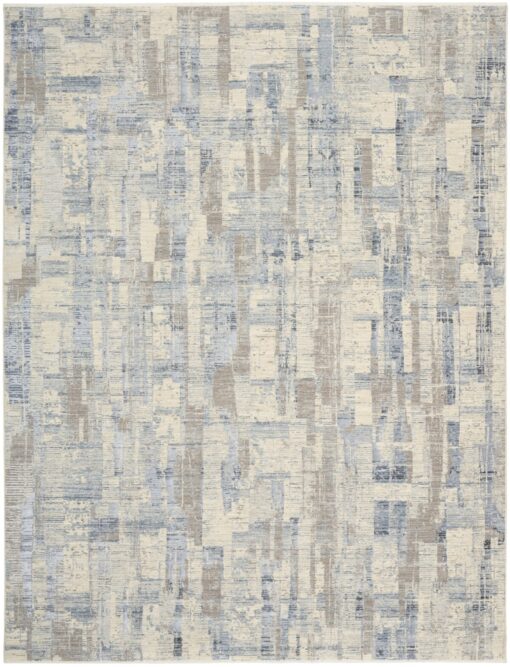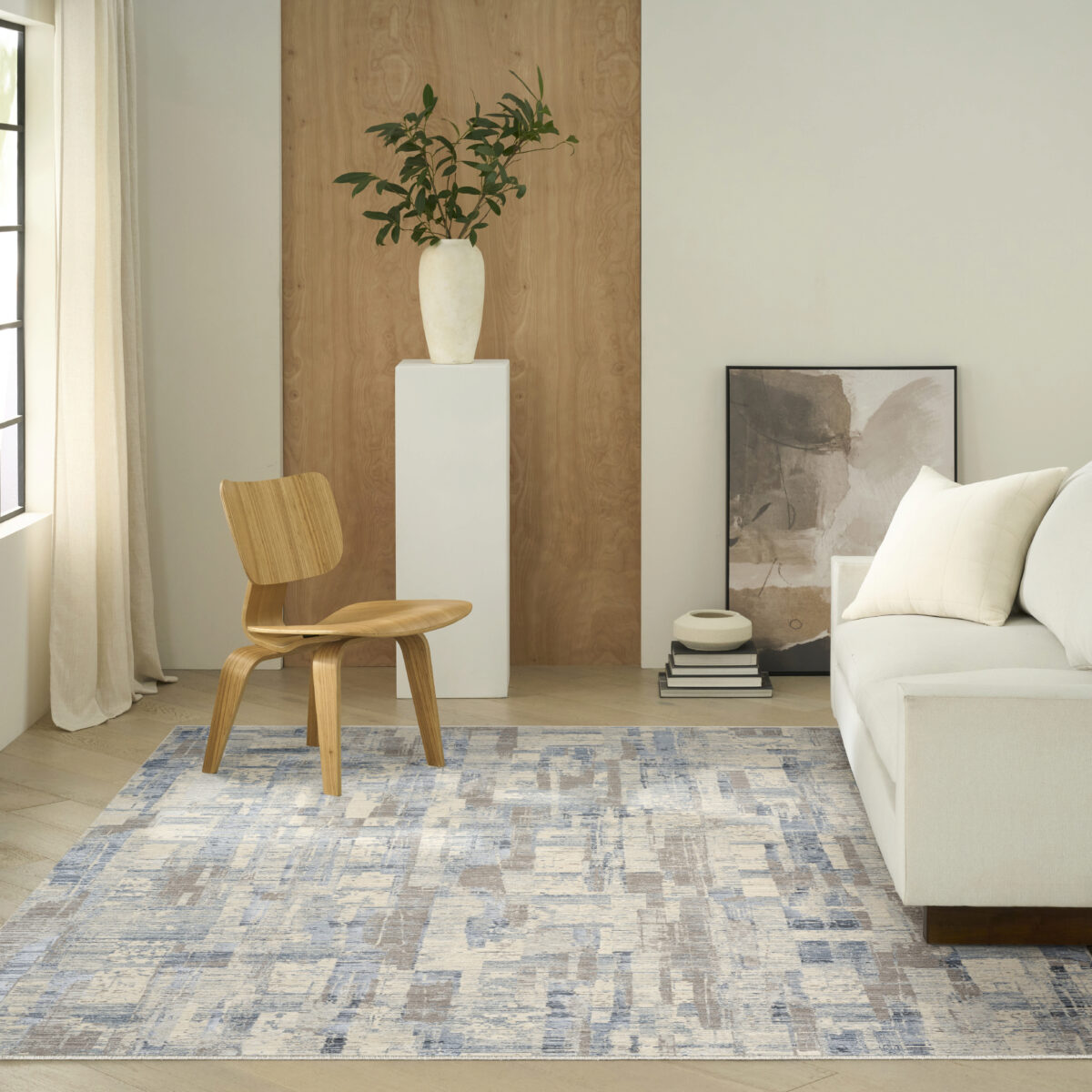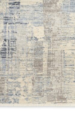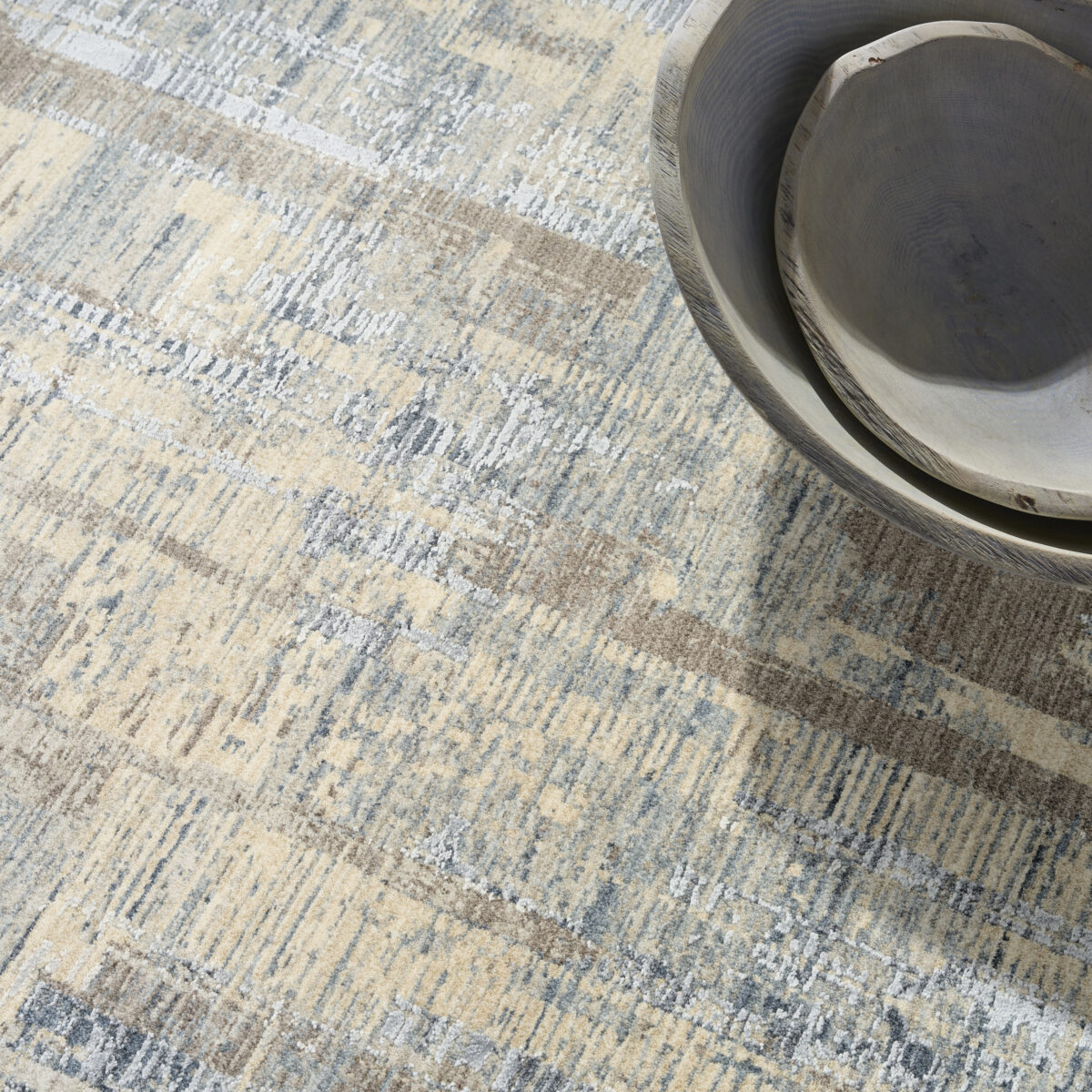 Invite a sense of calm with the blue and beige rug from the Calvin Klein Drift collection. The abstract pattern uses tonal striations that create a textured look with a relaxing effect, finished with a short fringe.