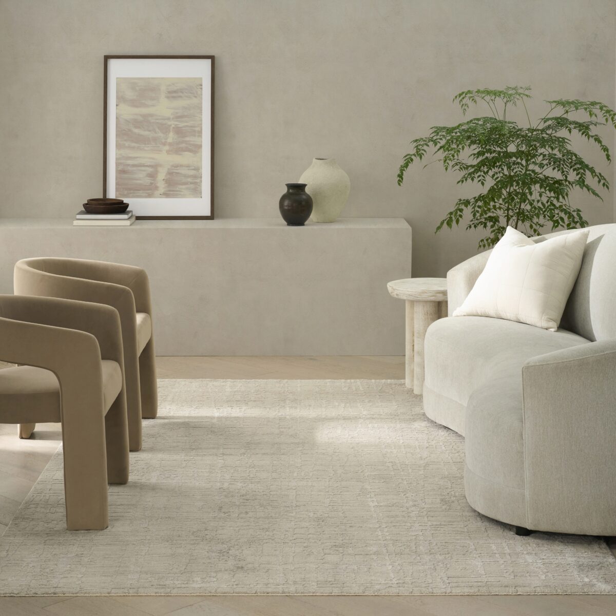 An understated design that grounds any space. The Calvin Klein Latitude abstract rug in beige features a rich, elegant sheen and short fringe finish. Made from softly textured polyester.