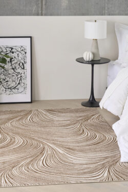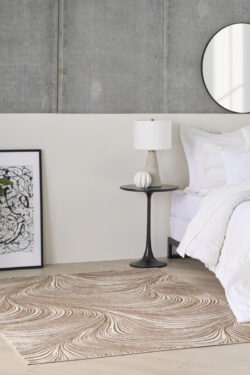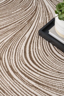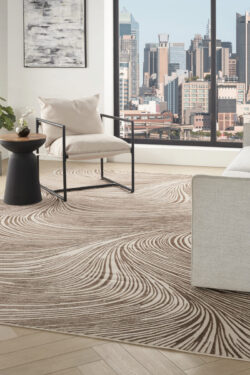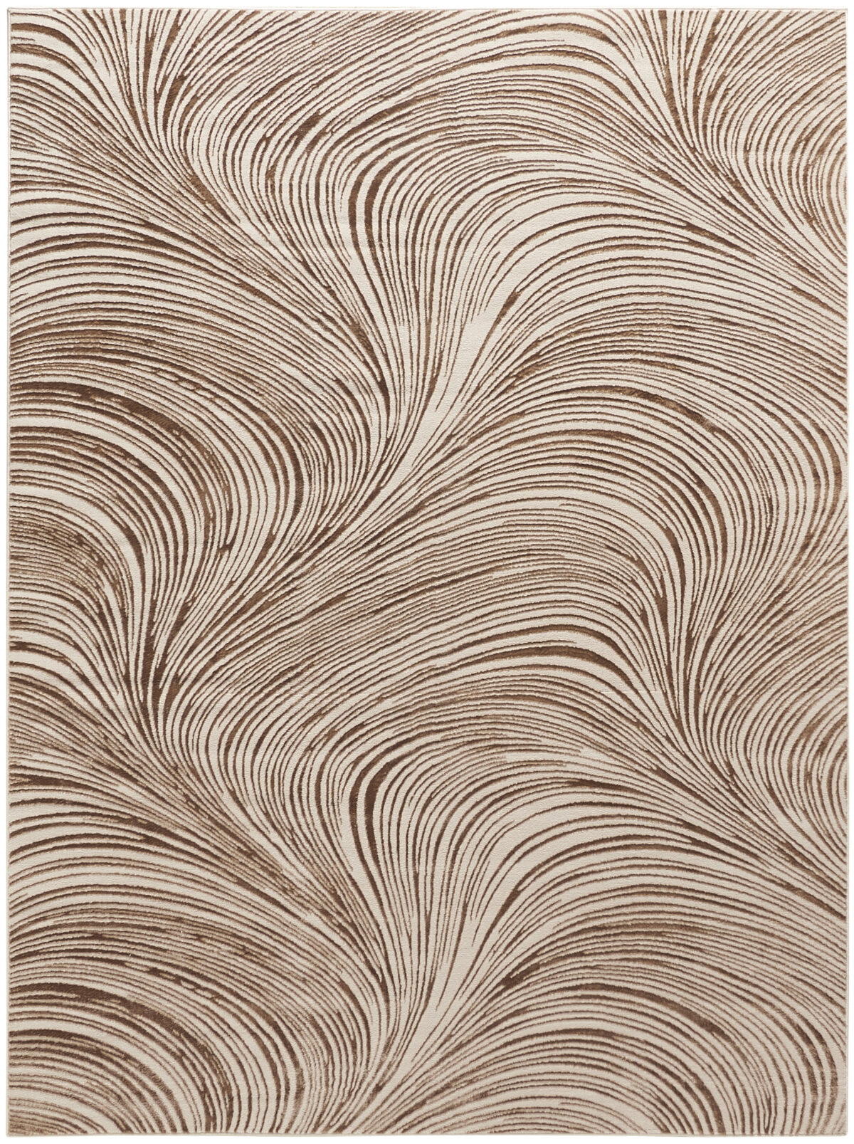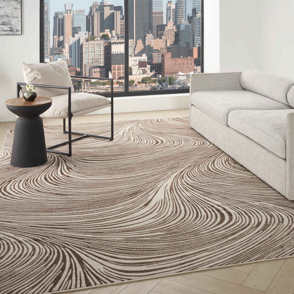 Introduce a touch of modern elegance to your home with this beige and brown abstract rug from the DKNY Central Park West collection. The swirling pattern creates a sense of flow that effortlessly ties your space together. Finished with a high-low weave and subtle sheen that adds movement and depth to any room.