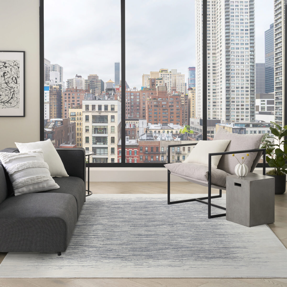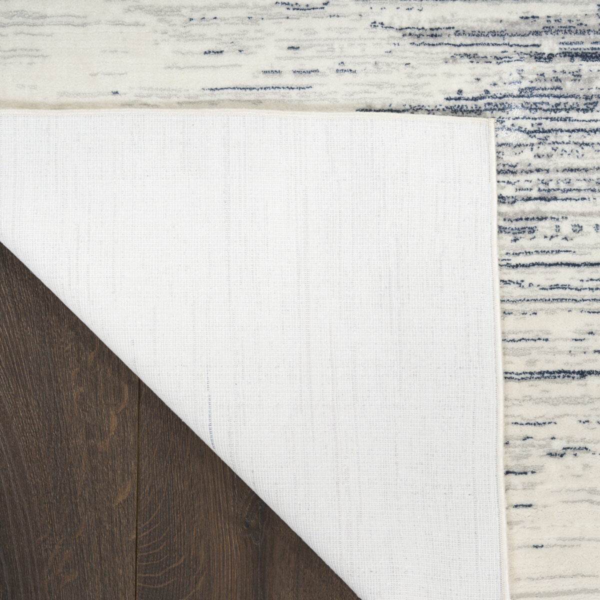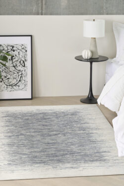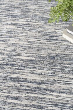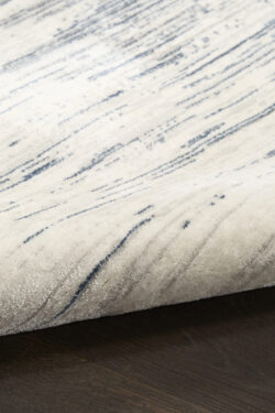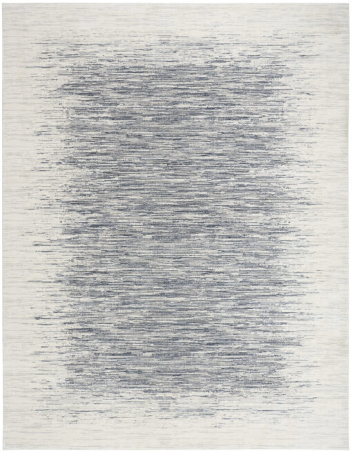 Add dimension to your space with this abstract blue and ivory rug from the DKNY Grand Street collection. The hazy linear design features tonal variations and a soft, silk-like sheen that catches the light. Finished in a low-profile, easy-care construction that fits seamlessly into modern interiors.