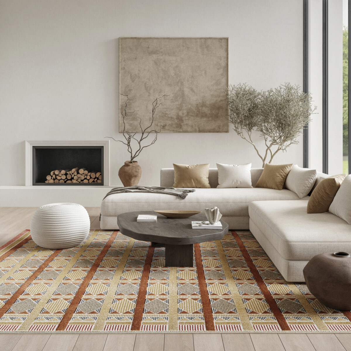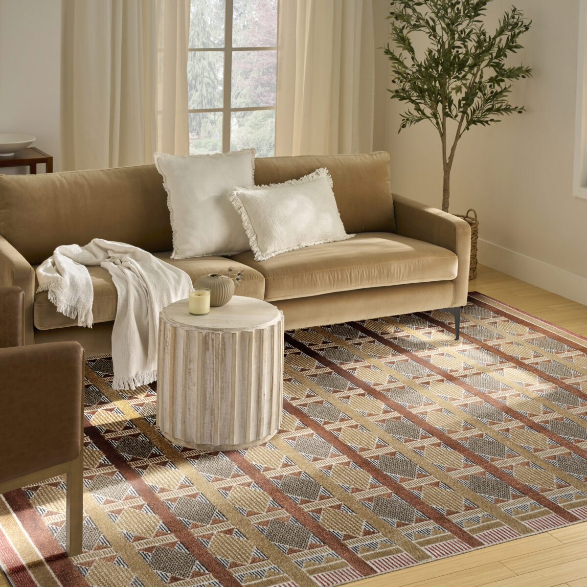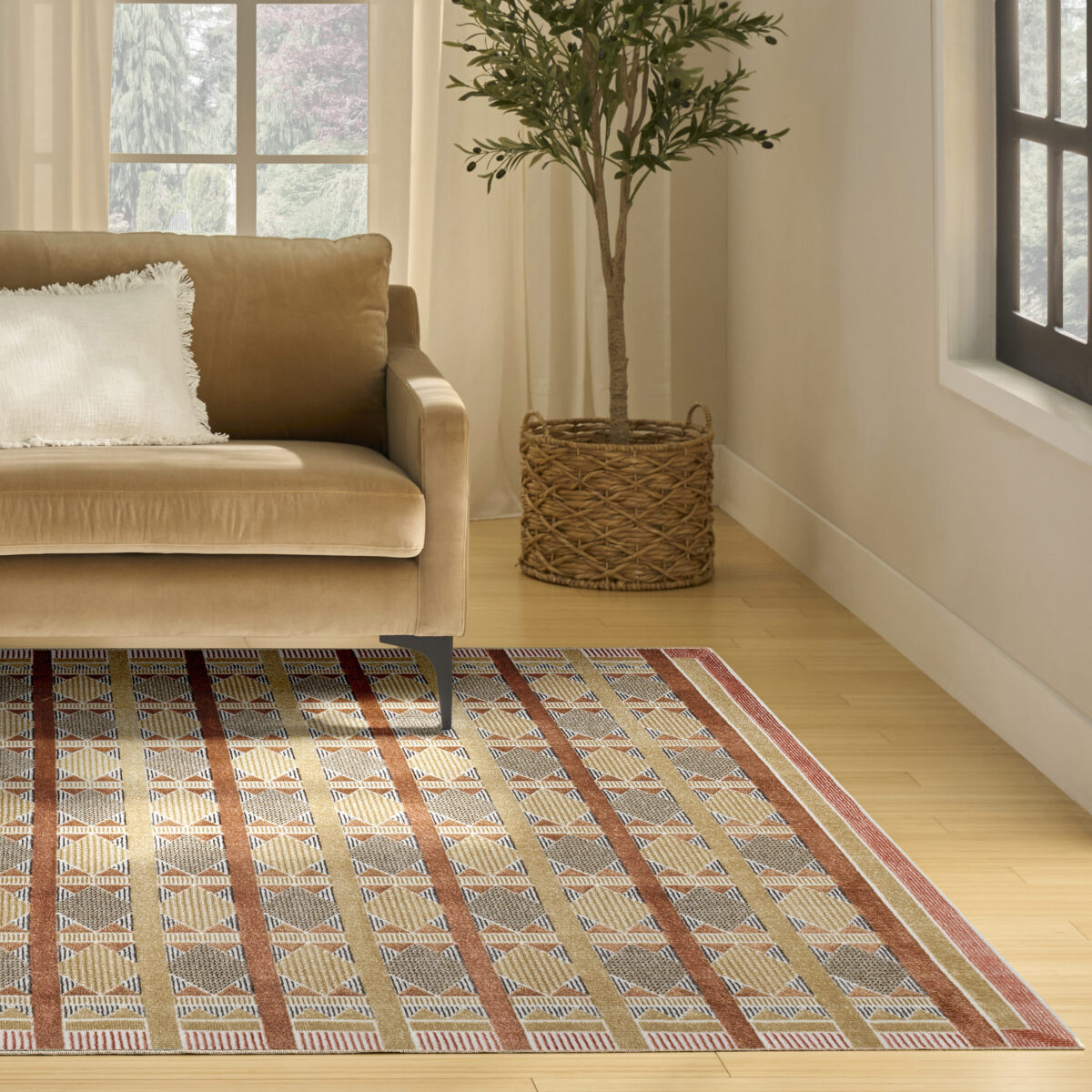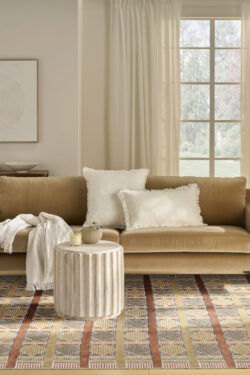 Invite a sense of calm to your décor with this rust, blue, and tan geometric rug from the Nordic collection. The Scandinavian-inspired diamond pattern emphasizes symmetry and simplicity, bringing a clean and balanced look into your surroundings. This modern rug is enhanced by a subtle shimmer and high-low pile for added movement and dimension.