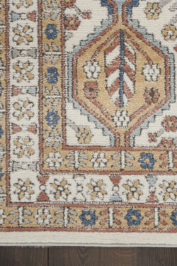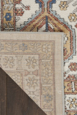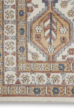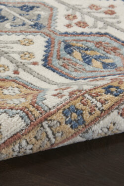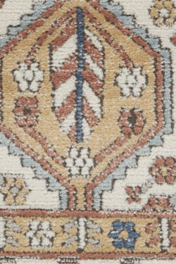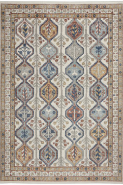 Richly colourful and beautifully rhythmic, this geometric area rug from the Quarry Collection features slender rows of lozenge-shapes filled with intricate details. A dazzling example of traditional Persian design, it has a classic ornamental border, vintage fade finish and surged edge. Thick and soft power-loomed cut pile in a polyester and polypropylene blend provides fabulous texture and comfort.