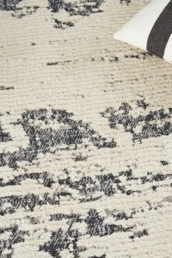 Enjoy the easy comfort of a minimalist look in this elegant and sophisticated Zermatt area rug. Its abstract design is beautifully enhanced by the dimensional, high-low pile combining low-loop and high-plush textures. Inky blue colour fields accent the striated ivory ground for a versatile colour scheme at home in the contemporary room.